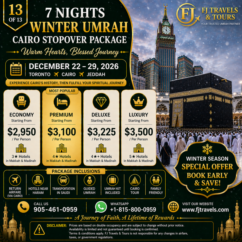 FJ Travels and Tours is a trusted Canadian travel agency offering affordable Hajj and Umrah packages, international flights, customized vacation tours, and reliable visa assistance. With over 15 years of industry experience, we specialize in delivering seamless, stress-free travel experiences for individuals, families, and groups. Whether you’re planning a spiritual journey to Saudi Arabia, a luxury trip to Dubai or Turkey, or need expert flight booking services, our dedicated team is here to support you 24/7. We provide competitive pricing,