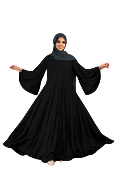 This abaya flows beautifully in Black, with a wide, flared hem that moves gracefully with every step. Its A-line shape gives a statuesque, airy silhouette.