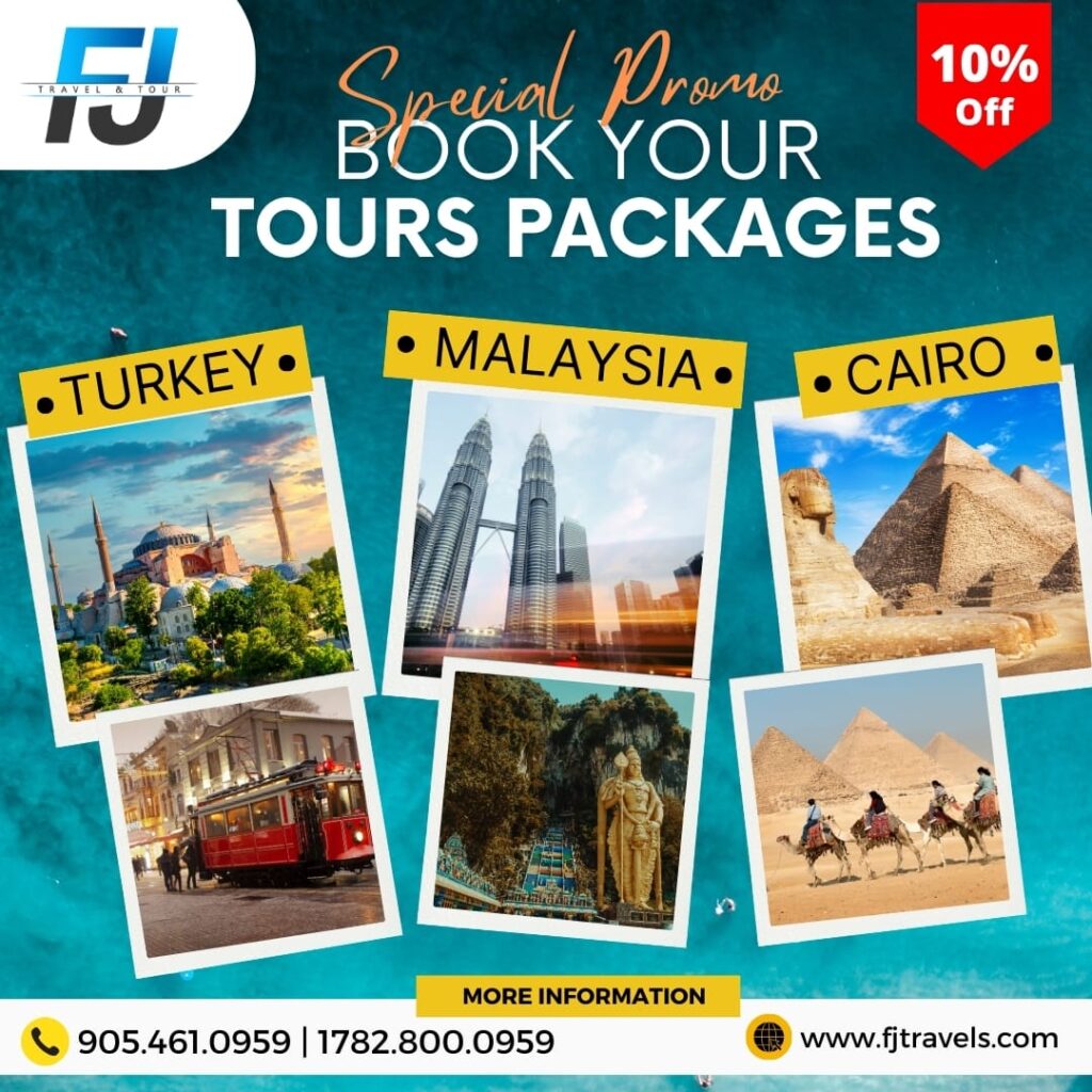 FJ Travels & Tours proudly offers year-round airline tickets and vacation packages to top destinations including Dubai, Turkey, and Cairo — with many more exotic options available. Whether you’re flying from Toronto, Calgary, Vancouver, or Montreal, our team finds you the lowest airfares and best-value hotel deals that fit your budget and travel style.