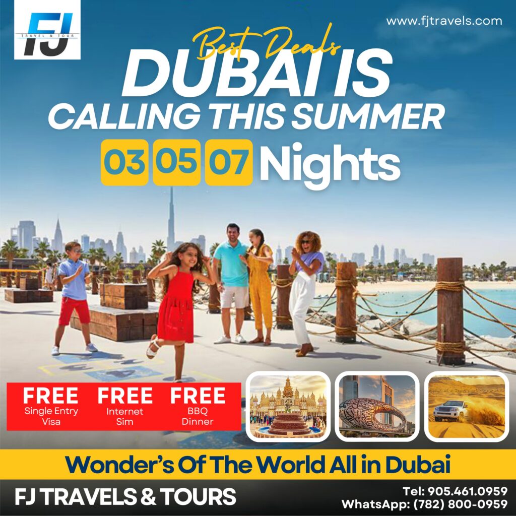 FJ Travels & Tours proudly offers year-round airline tickets and vacation packages to top destinations including Dubai, Turkey, and Cairo — with many more exotic options available. Whether you’re flying from Toronto, Calgary, Vancouver, or Montreal, our team finds you the lowest airfares and best-value hotel deals that fit your budget and travel style.